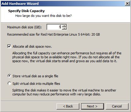 When the Specify Disk Capacity menu appear, set the new disk size at 5GB. This should be just enough to support our demo RAC database. If you have an abundance of disk space then by all means set the disk size much larger.