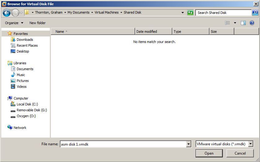 VMware Workstation stores its VMs by default in the user’s Documents directory under a sub-directory called Virtual Machines. In this directory you will find sub-directories for both our VMs Orpheus and Eurydice. I suggest creating a new sub-directory here called Shared Disk and storing our new virtual disk in the Shared Disk directory with the name asm disk 1.vmdk.