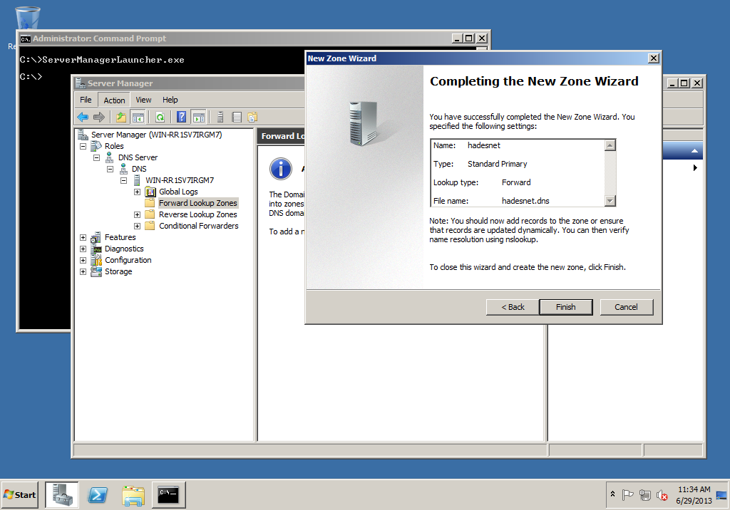 Using the wizard, create a new Primary Zone called hadesnet. The wizard will suggest a new file of hadesnet.dns and you should accept this file-name.
