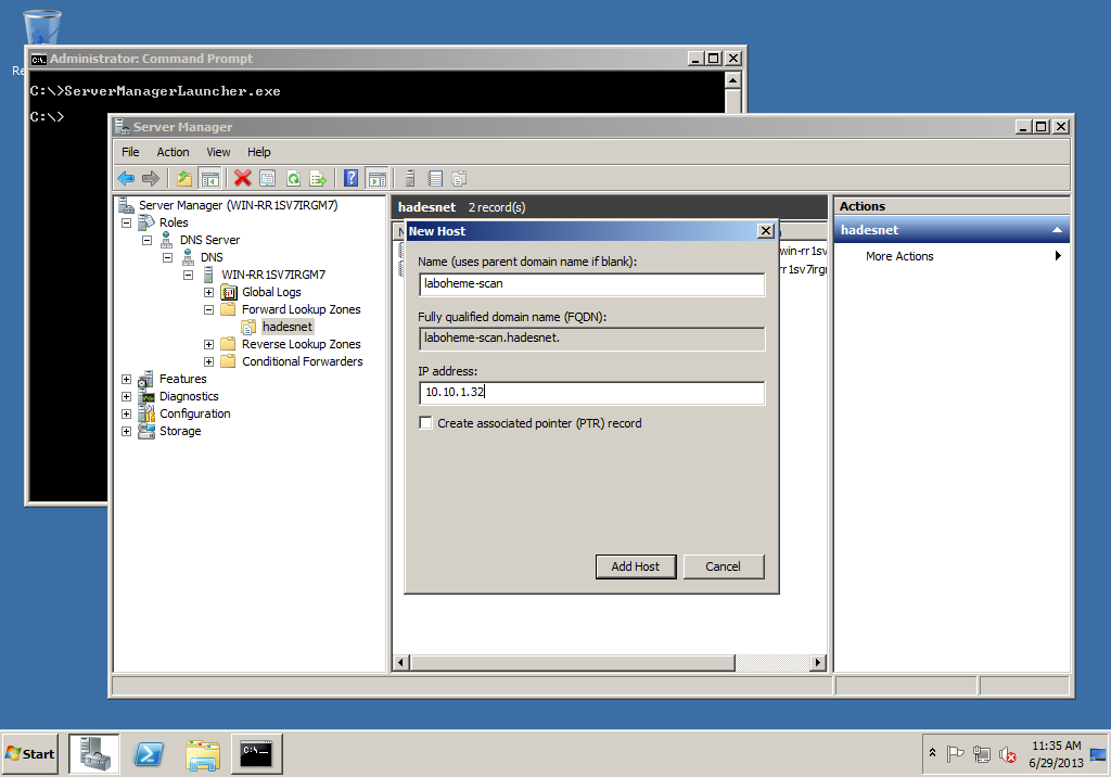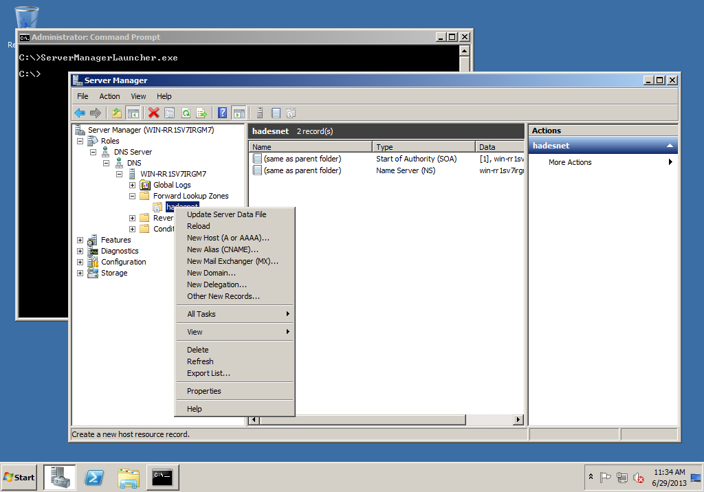 Under the Forward Lookup Zones you should now see the hadesnet zone listed. Right click on the zone and select New Host (A or AAAA)….