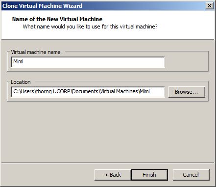 VMware will prompt you for a name for your new clone. In my example I cloned the exisitng machines called Rodolfo to create the machine Mimi.