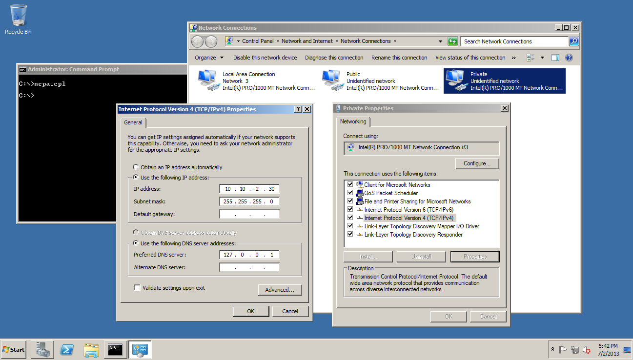 Use the ncpa.cpl command again to access the Network Connections interface, and repeat the steps you used in Step 2 to change the Private IP address to 10.10.2.40, and the Public IP address to 10.10.1.40.