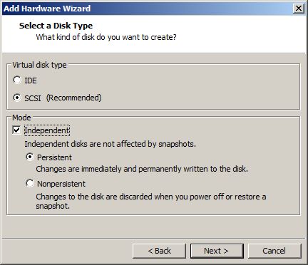 When the Select a Disk Type menu appears, select SCSI (Recommended) and for mode check Indepenent and the radio button Persistent.