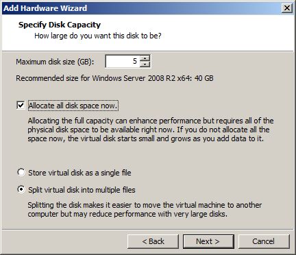 Next we are going to create a partition on the disk. With Windows Server 2008, Windows now automatically offsets the partition to 1MB.