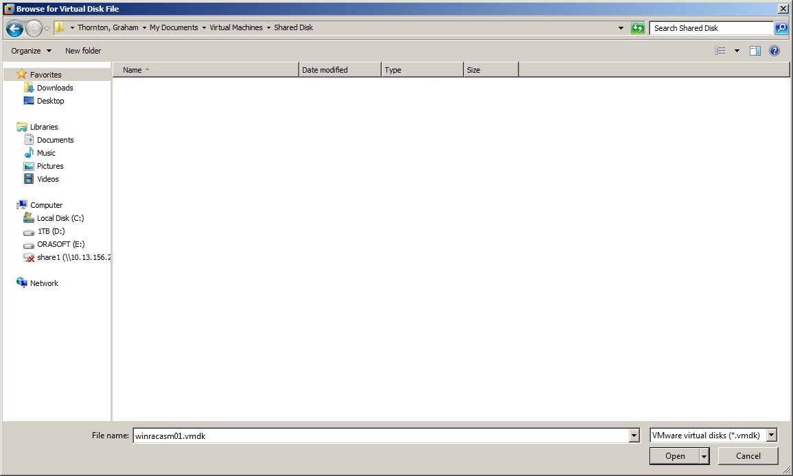 VMware Workstation stores its VMs by default in the user’s Documents directory under a sub-directory called Virtual Machines. In this directory you will find sub-directories for both our VMs Rodolfo and Mimi. I suggest creating a new sub-directory here called Shared Disk and storing our new virtual disk in the Shared Disk directory with the name asm disk 1.vmdk.
