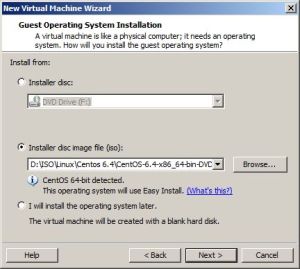 On the next screen we confirm that our new VM will be compatible with Workstation 9.0. On the next screen we point the installer at our ISO DVD image containing the CentOS 6.4 install media.