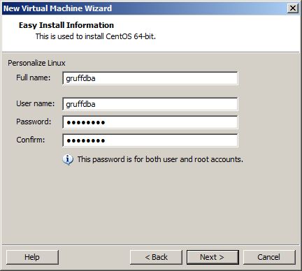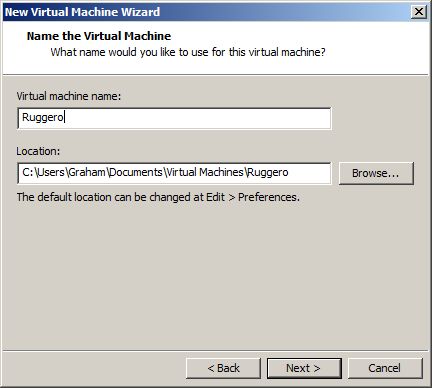 On the next screen we name our VM. I am going to continue my operatic theme from my earlier RAC blog posts Oracle 11gR2 2-node RAC on VMWare Workstation 8 and Oracle 11gR2 11.2.0.3 2-node RAC on Windows 2008 on VMWare Workstation 9, and this time draw from the opera La Rondine. My first VM is named Ruggero, but obviously you can choose whatever you like.
