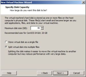 Next we size the new disk at 40GB and select “Split virtual disk into multiple files”. At the end of the install the new disk will actually be about 6GB, but sizing it larger allows us to install the Oracle binaries later on.
