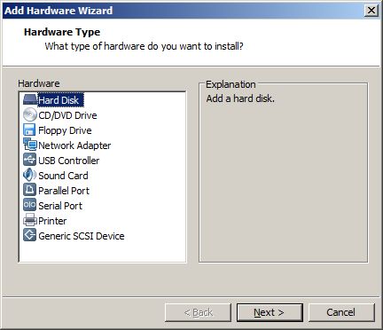 At the Add Hardware Wizard menu, select Hard Disk and click Next.