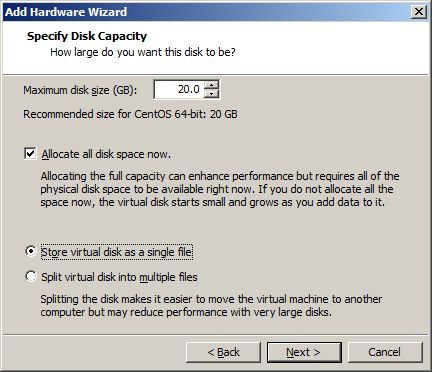 NOTE: These last two options are very important for our RAC. Trying to create a shared disk with VMware Workstation using thin-provisioning will result in disk corruption.