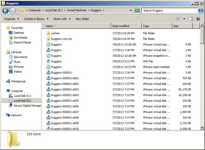 VMware Workstation stores its VMs by default in the user’s Documents directory under a sub-directory called Virtual Machines. In this directory you will find sub-directories for both our VMs Ruggero and Magda.