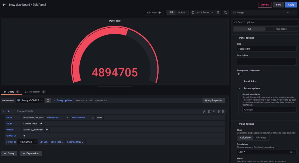 In Grafana I add a new panel and select Gauge as the control. I set the data source to my PostgreSQL database and the ORA_IOSTATS_FILE_DELTA table. The column selected is READS and the time column is again TS: